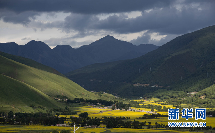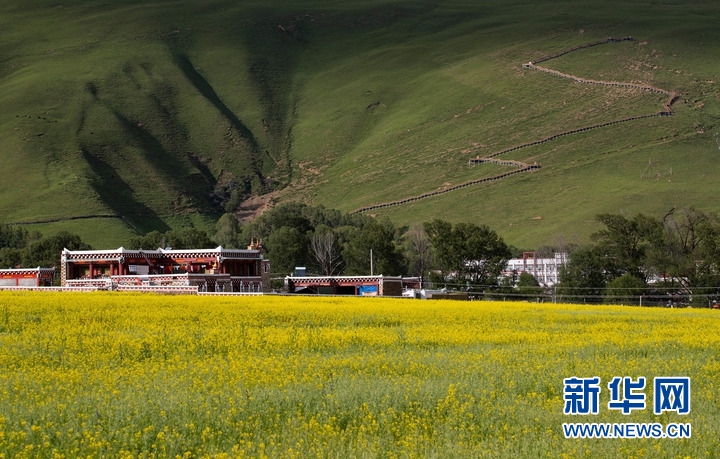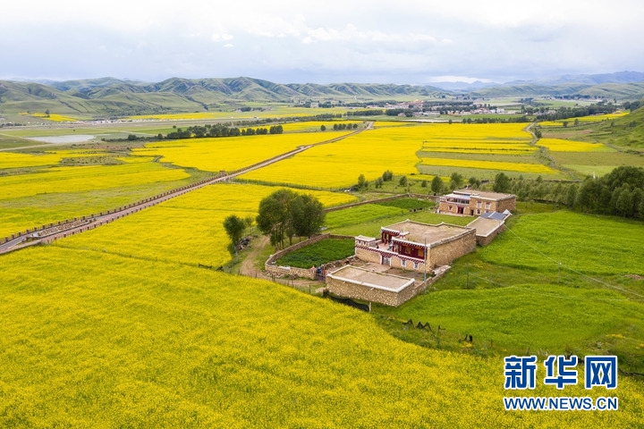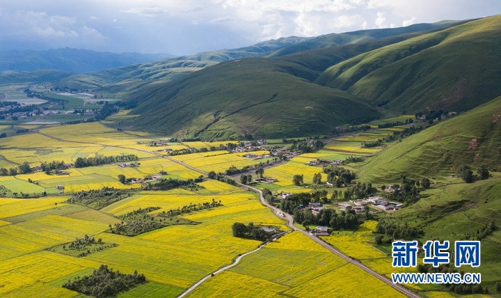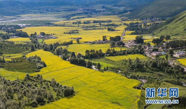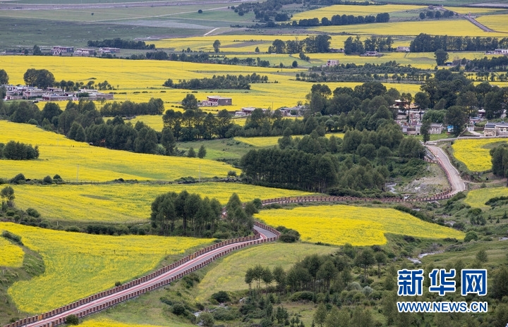 7月24日,在道孚縣泰寧鎮(zhèn),民居點綴在成片的油菜花海中。新華社記者 江宏景 攝