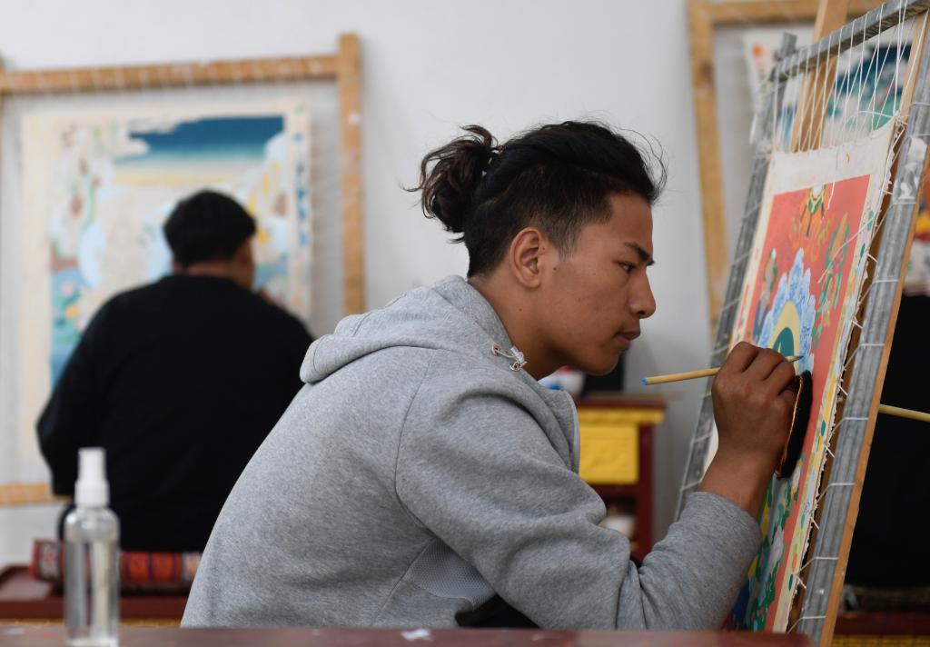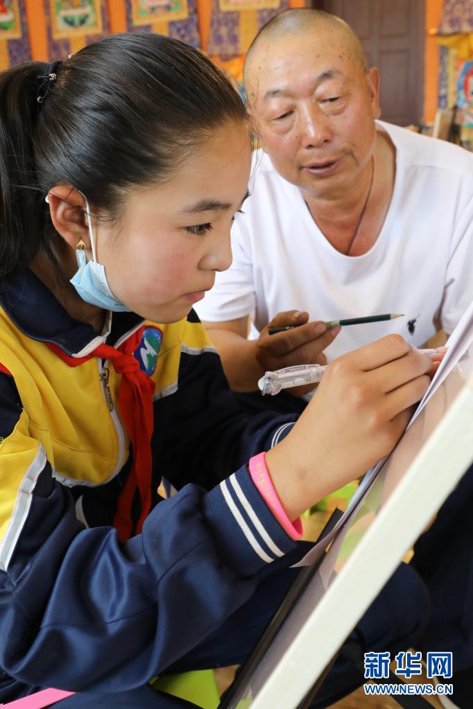 9月2日,黃南藏族自治州同仁市熱貢藝術(shù)完全小學(xué)六年級(jí)學(xué)生才讓央宗在唐卡繪畫(huà)老師旦巴的指導(dǎo)下畫(huà)畫(huà)。新華社記者 馬千里 攝