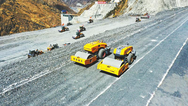 兩河口水電站大壩堆石區(qū)智能碾壓。(圖片由雅礱江流域水電開發(fā)有限公司提供)