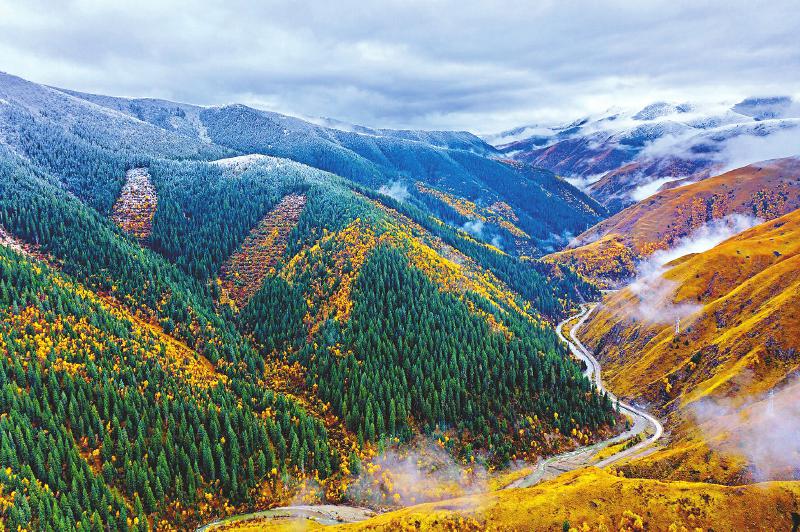 10月27日,阿壩縣以茸安—柯河峽谷為代表的高山峽谷、原始森林生態(tài)系統(tǒng)自然景觀(guān)區(qū)內(nèi),彩林紅了,山頂降雪變白了。用旦 攝