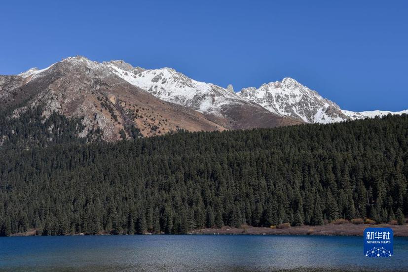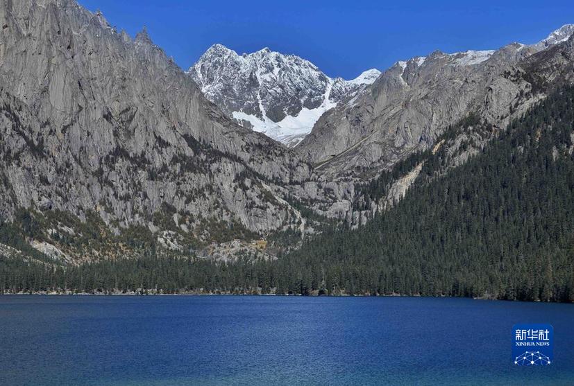 這是10月24日在措普溝景區(qū)內拍攝的扎金甲博神山和措普湖。新華社記者 劉坤 攝