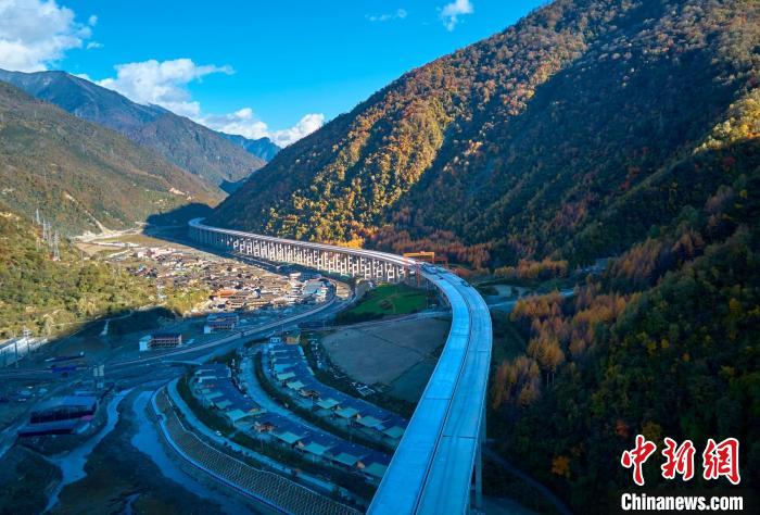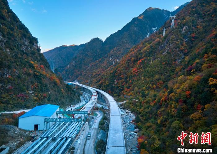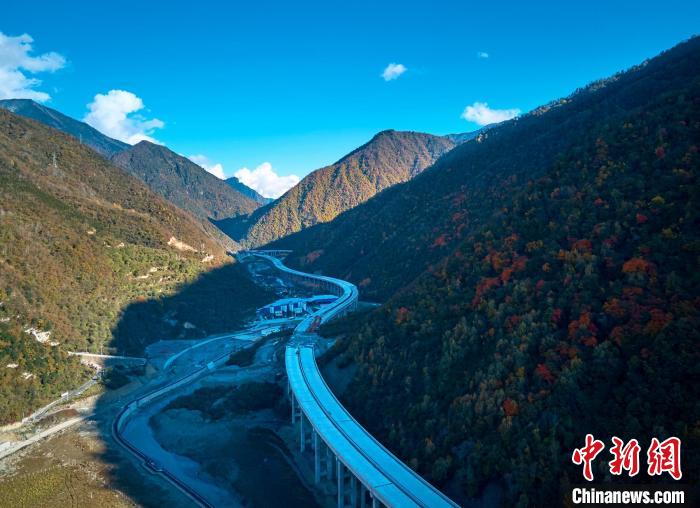 深秋時(shí)節(jié),四川省綿陽(yáng)市平武縣紅葉滿(mǎn)山,層林盡染,仿佛打翻的調(diào)色盤(pán),正在建設(shè)的九綿高速宛若一條玉帶穿行其中,想象通車(chē)后駕車(chē)行駛在這條高速上,如遨游在五彩斑斕的彩林畫(huà)廊中一般,讓人心曠神怡。