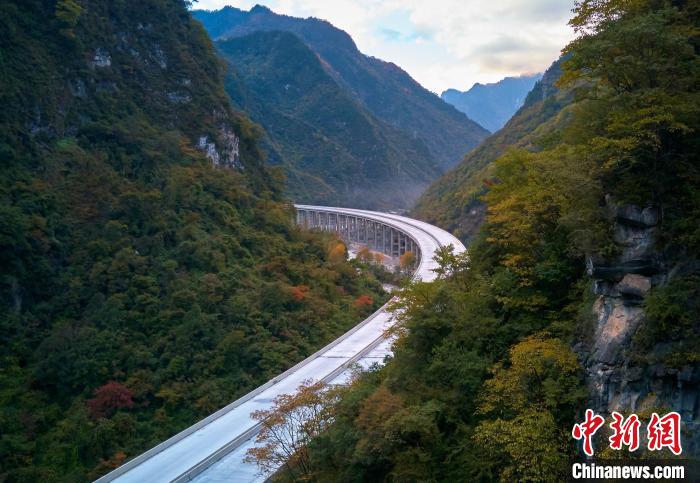 四川平武:九綿高速宛若一條玉帶 點(diǎn)綴五彩斑斕的滿(mǎn)山彩林
