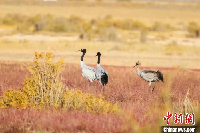 圖為黑頸鶴在濕地中漫步。青海省林草局供圖