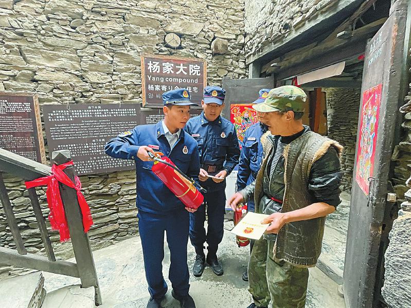 在被譽(yù)為“羌族建筑藝術(shù)活化石”的桃坪羌寨,羌族每家都設(shè)“火塘”,羌寨內(nèi)部采用木材構(gòu)造,稍有不慎極易引發(fā)火災(zāi)。到寨子組織滅火演練、開展防火巡查、宣傳消防知識(shí)、提供便民服務(wù),就成了陳洪橋和戰(zhàn)友們每天雷不打不動(dòng)的事,“一定要注意用火用電!”“老鄉(xiāng),請記得‘人走火滅’哦!”“你好,需要幫助嗎?”……這是他們每天不厭其煩對(duì)寨中群眾和游客重復(fù)最多的話。寨中每一條疏散通道、每一條暗溝水渠以及每一家房子結(jié)構(gòu)布局,消防員們都了然于胸、爛熟于心。