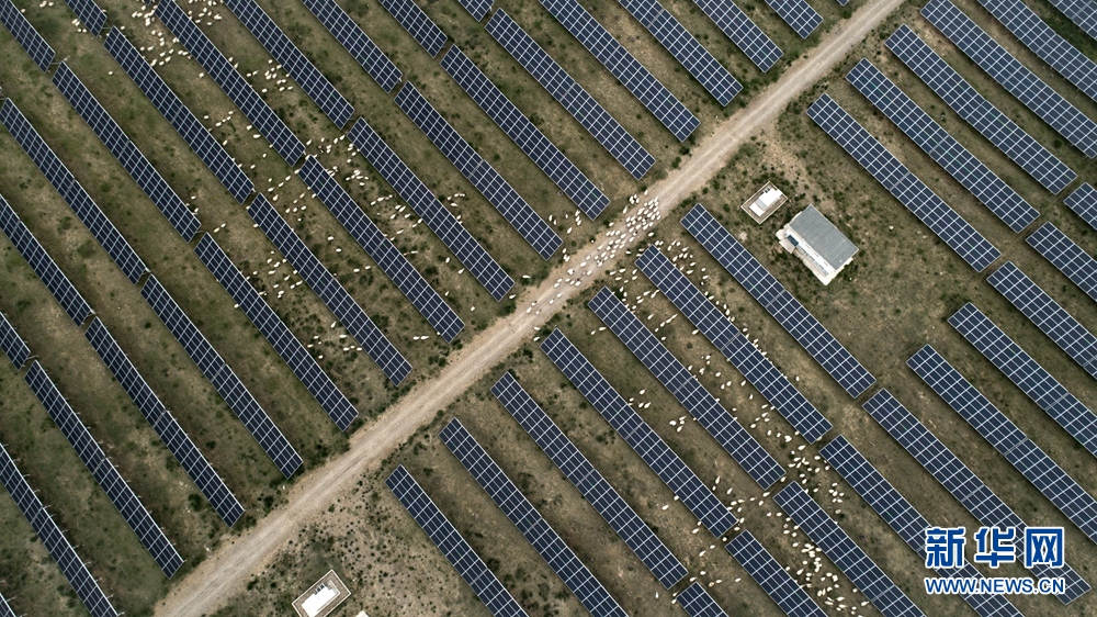 羊群在青海省海南藏族自治州共和光伏產業(yè)園吃草(無人機照片)。新華社記者 吳剛 攝