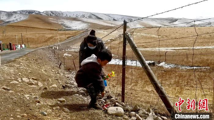 在青海省海北藏族自治州祁連縣青陽溝內(nèi),3歲的小扎西轉(zhuǎn)動著手中的風鈴,跟在母親忠可措身后開始一天的巡山。
