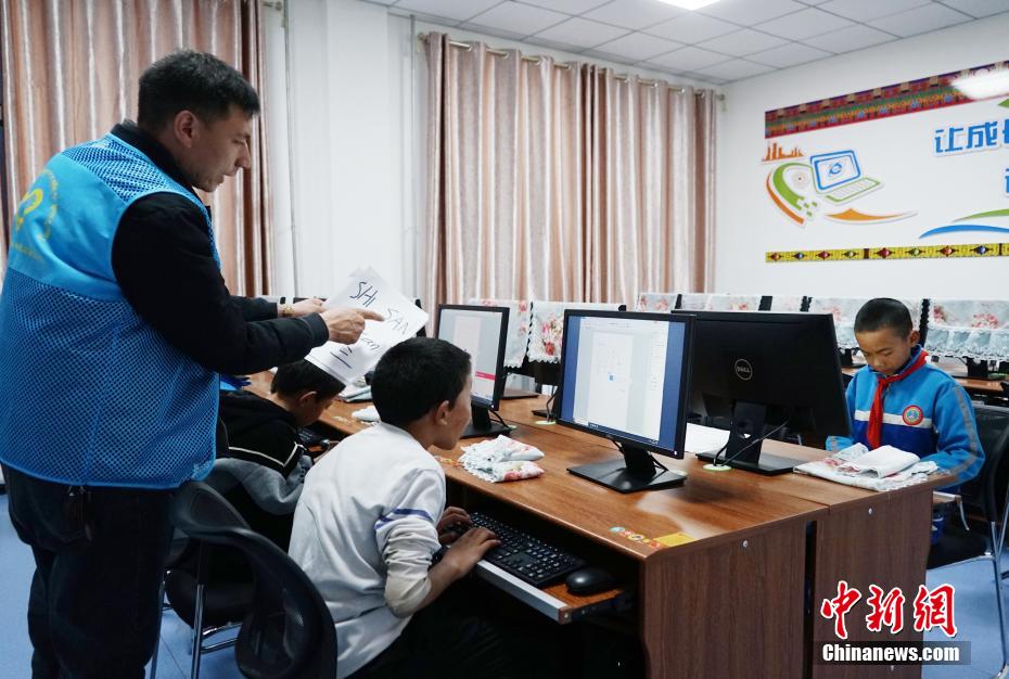 圖為志愿者輔導孩子們學習電腦打字。馬銘言 攝
