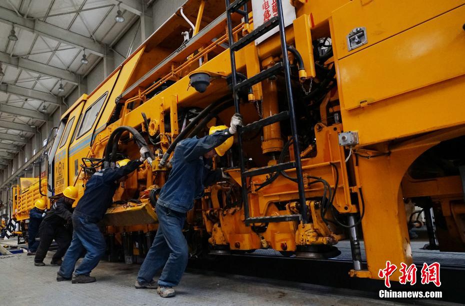 圖為職工正在檢修大型養(yǎng)路機。馬銘言 攝