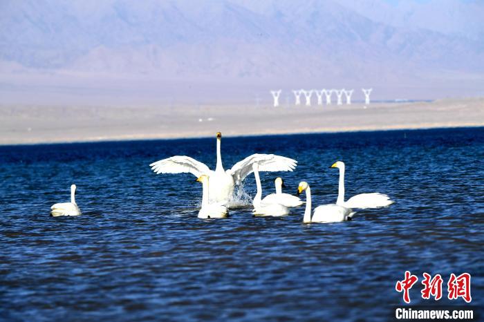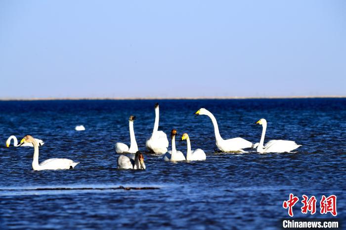 圖為天鵝群在湖中游蕩。青海多美生態(tài)環(huán)保科技有限公司 供圖