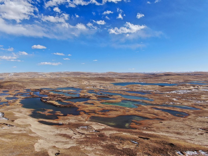 在青海省果洛藏族自治州瑪多縣境內(nèi)拍攝的一處濕地(無人機照片)。新華社記者 張龍 攝