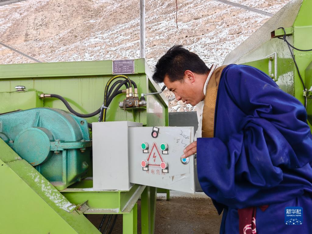 4月27日,在青海省玉樹藏族自治州稱多縣三江源高原現(xiàn)代生態(tài)牧業(yè)示范點,工作人員在清理草料拌料機。新華社記者 柳澤興 攝