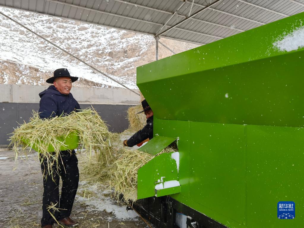 4月27日,在青海省玉樹藏族自治州稱多縣三江源高原現(xiàn)代生態(tài)牧業(yè)示范點,昂巴拉農(nóng)牧民專業(yè)合作社理事長布德在處理草料。新華社記者 柳澤興 攝