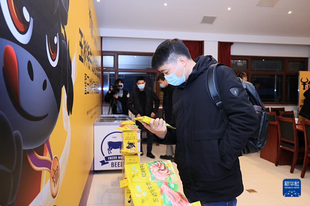2月23日,“玉樹牦牛進北京”懇談會暨玉樹牦牛美食品鑒會在北京舉行,消費者在挑選月盛齋制作的玉樹牦牛肉醬鹵產(chǎn)品。新華社發(fā)