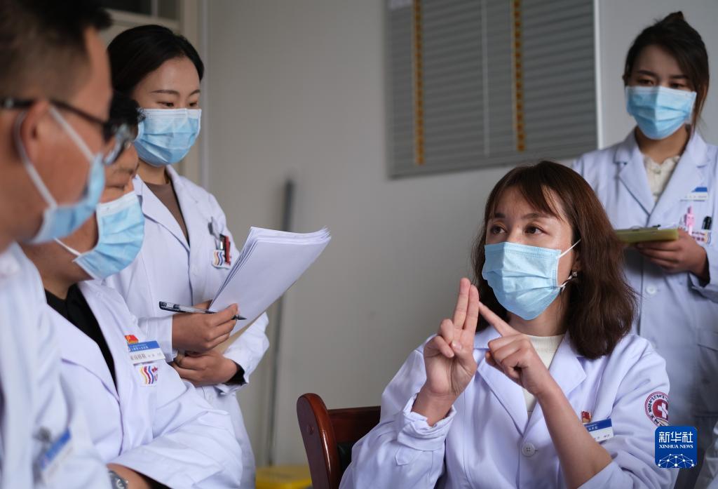 青海省人民醫(yī)院醫(yī)生、青南支醫(yī)隊員謝延玲(右二)和玉樹藏族自治州人民醫(yī)院醫(yī)生探討患者病情。新華社記者 央秀達珍 攝