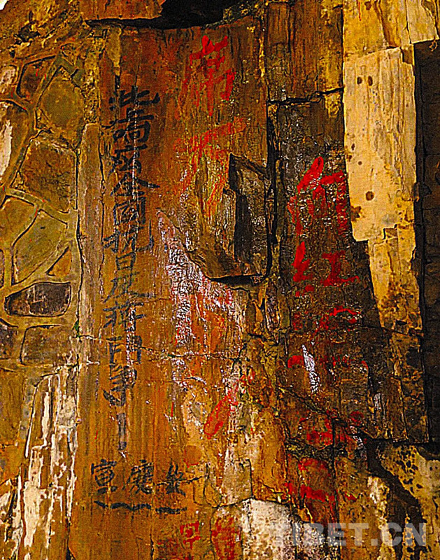 圖為一九三五年七月,中國(guó)工農(nóng)紅軍二方面軍第六軍團(tuán)在長(zhǎng)征途中,曾路過(guò)班瑪、久治一帶,并在班瑪絨玉地區(qū)的森林石壁上刻下的“北上響應(yīng)全國(guó)抗日反蔣斗爭(zhēng)”的標(biāo)語(yǔ)