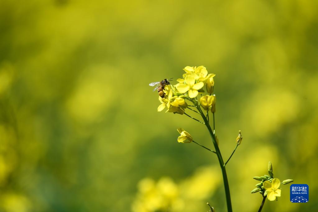 7月2日,在青海省海北藏族自治州門源回族自治縣境內(nèi)的油菜花田里,一只蜜蜂在采蜜。新華社記者 張龍 攝
