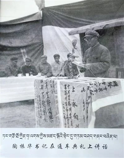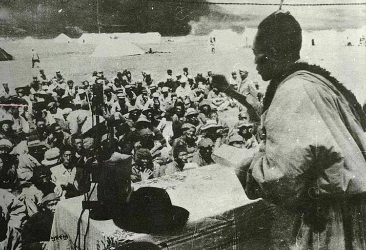圖為1952年8月工作團(tuán)在達(dá)日縣查郎寺召開果洛頭人、代表聯(lián)誼會(huì)議,扎喜旺徐團(tuán)長(zhǎng)在聯(lián)誼會(huì)議上作有關(guān)民族團(tuán)結(jié)的報(bào)告。圖片由央金提供