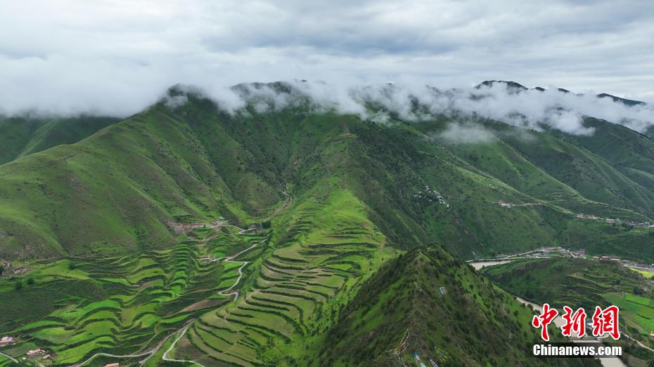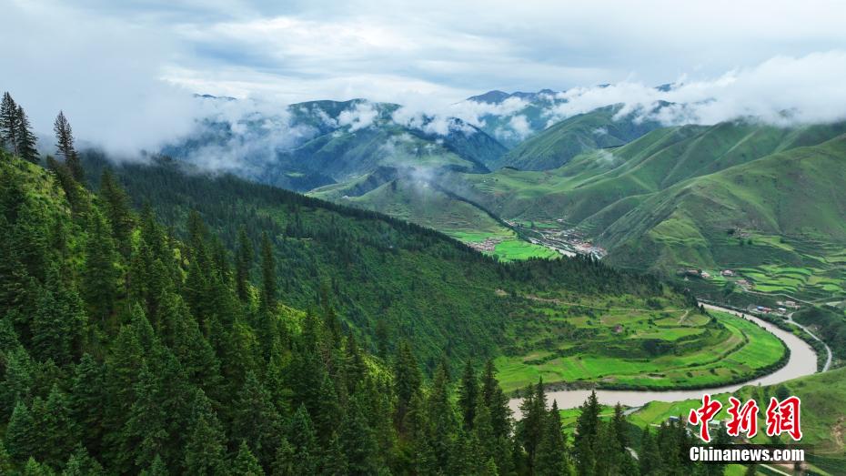 7月11日,一場(chǎng)降雨過后,云霧如潔白的哈達(dá)飄落在青海省果洛藏族自治州班瑪縣瑪可河國(guó)家森林公園山頭,與樹木、河流、梯田相互映襯,自然風(fēng)景美如畫。