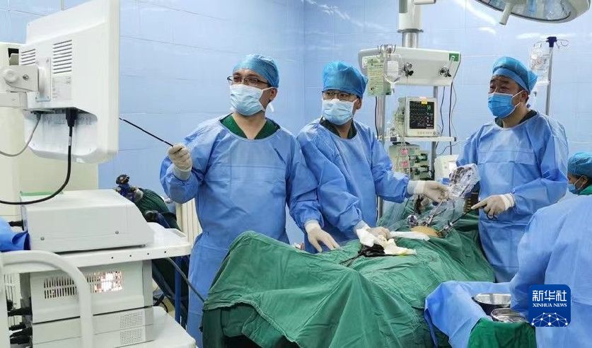 2021年,天津援青醫(yī)生李永元(左一)在黃南州人民醫(yī)院指導當?shù)蒯t(yī)生開展腹腔鏡手術(shù)。(圖片由天津援青指揮部提供)