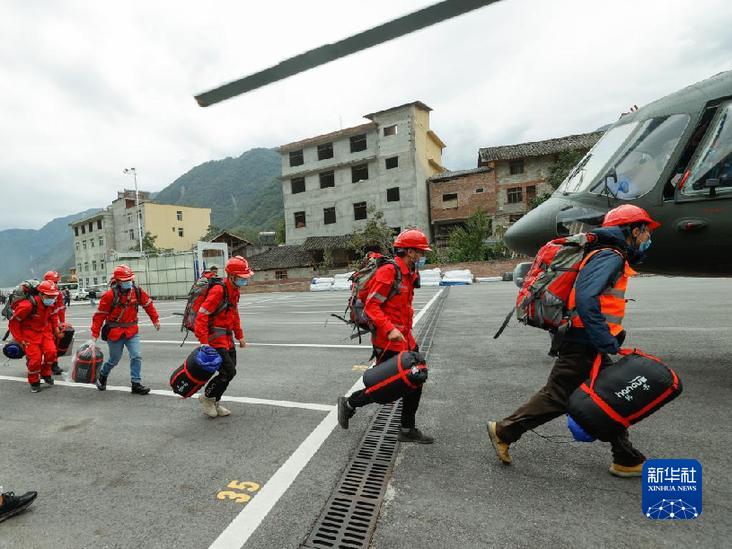 9月7日,在四川省甘孜州瀘定縣磨西鎮(zhèn),四川省冶勘設計集團有限公司的6名調查隊員攜帶裝備搭乘直升機前往海螺溝景區(qū)開展地質災害應急排查工作。新華社記者 沈伯韓 攝