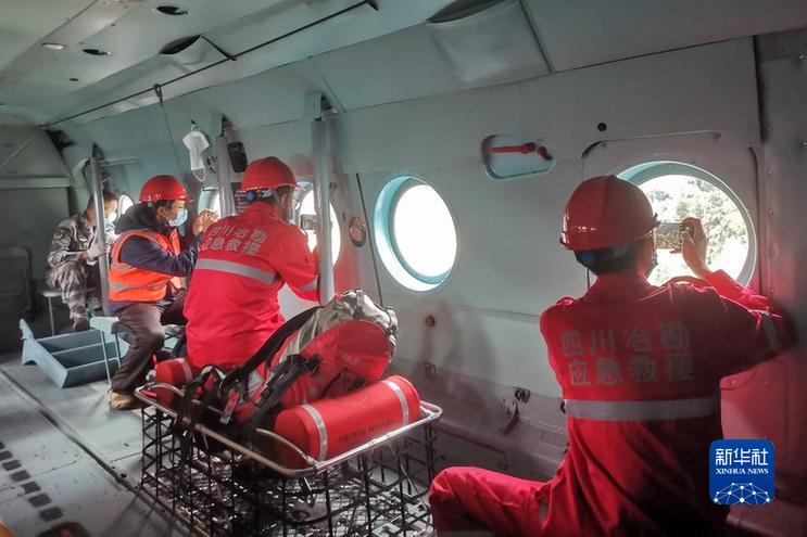 9月7日,四川省冶勘設計集團有限公司的調查隊員在前往海螺溝景區(qū)的直升機上拍攝。新華社發(fā)(四川省冶勘設計集團有限公司供圖)