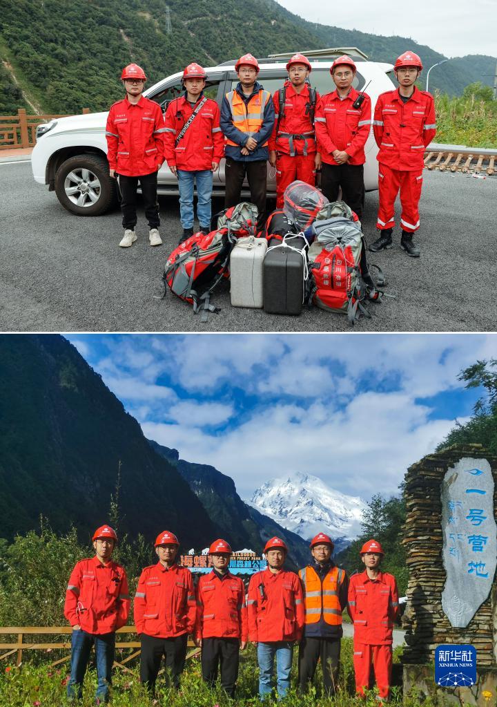 這是一張拼版照片,上圖為:9月7日,四川省冶勘設計集團有限公司的6名調查隊員在搭乘直升機去往海螺溝前拍攝的合影(新華社記者沈伯韓攝);下圖為:9月10日,6名調查隊員在海螺溝景區(qū)一號營地拍攝的合影(四川省冶勘設計集團有限公司供圖)。新華社發(fā)