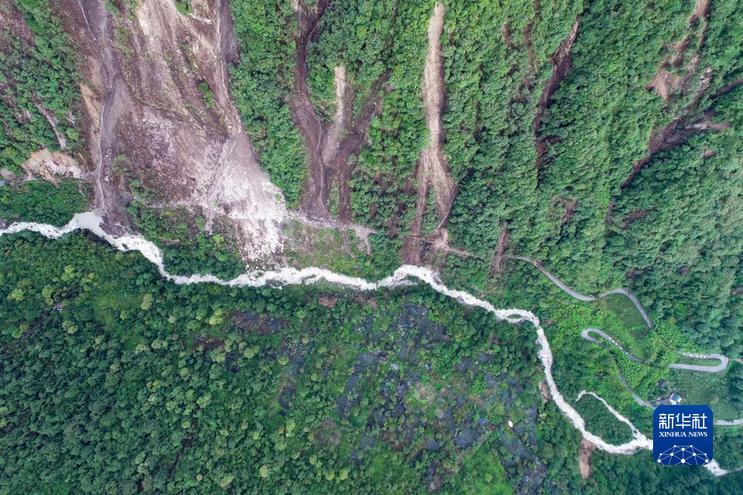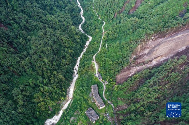 這是9月7日拍攝的海螺溝景區(qū)一號營地下游處的崩塌災害現(xiàn)場(左上部分)(無人機照片)。新華社發(fā)(四川省冶勘設計集團有限公司供圖)