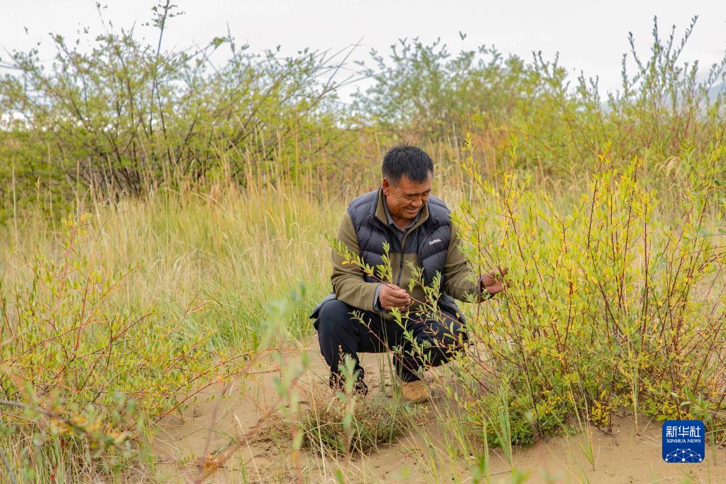 牧民卓瑪加布在黃河瑪曲段干流沿岸一處沙丘上查看他參與種植的灌木生長(zhǎng)情況(9月16日攝)。新華社記者 郎兵兵 攝