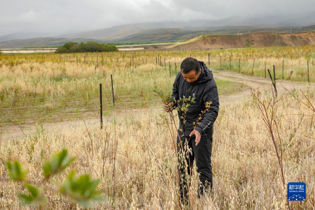 瑪曲縣自然資源局高級(jí)工程師馬建云在黃河瑪曲段干流沿岸一處阻沙林帶建設(shè)區(qū)域觀察植被生長(zhǎng)情況(9月16日攝)。新華社記者 郎兵兵 攝