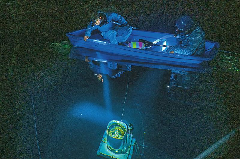 10月21日,陳明君(左)與團(tuán)隊工作人員觀察水下4.5米深的探測器單元的光電倍增管。