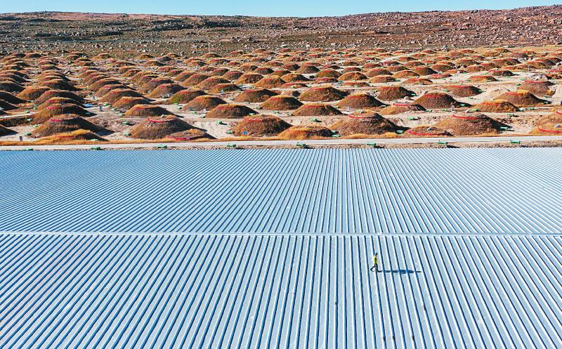 10月21日,科研人員行走在水切倫科夫探測器的屋頂上。遠(yuǎn)方的每個大概36平方米的土堆是拉索的繆子探測器,放置了裝有超純水的高反射率水袋。