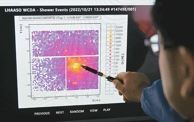 10月21日,科研人員在電腦上展示探測器的時間切片,片中顯示的帶顏色的光點,顏色越明亮,表明射線能量越強(qiáng)。