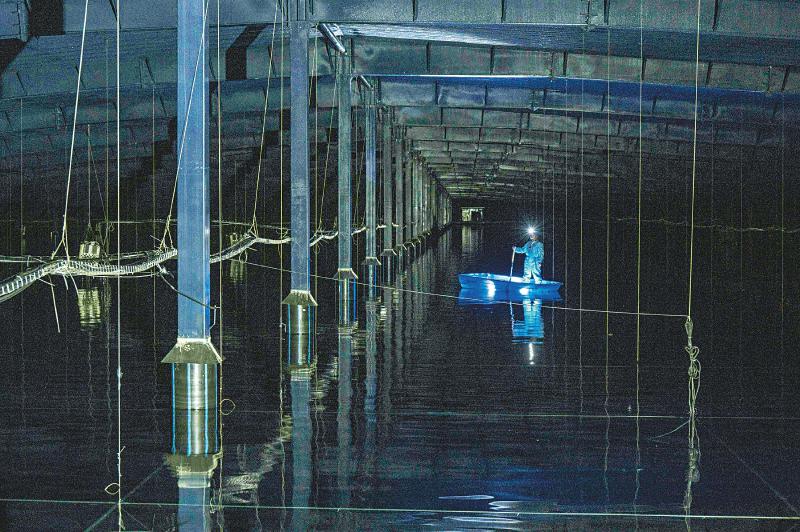 24日,陳明君和同事穿上潔凈服、戴上腳套,劃著小船進(jìn)入伸手不見五指的三號水池,他們要逐一檢查維護(hù)這里的探測器單元和電子學(xué)箱。船劃到指定位置,黑暗中陳明君的頭燈光束直射水底,水下碩大的探測器單元核心設(shè)備——光電倍增管,被照得清晰可見,他和同事一起用“鉤子”把光電倍增管拉起,進(jìn)行檢查?!八乩锏纳疃仁?.5米,這些純凈水的透明度比自來水高三倍以上,切倫科夫光就從里面捕獲?!标惷骶嬖V記者。