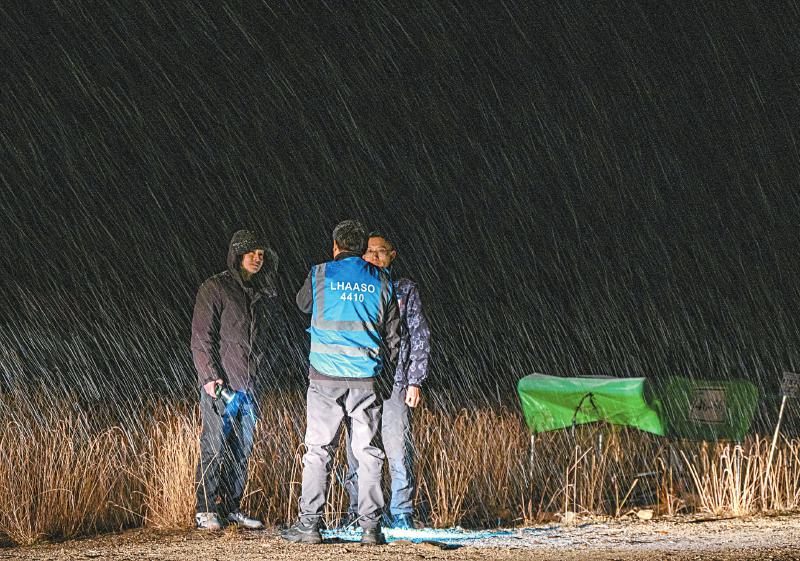 10月24日晚,拉索迎來了今秋的第一場大雪,走出水切倫科夫探測器的陳明君(中)與團(tuán)隊工作人員討論需要解決的問題。