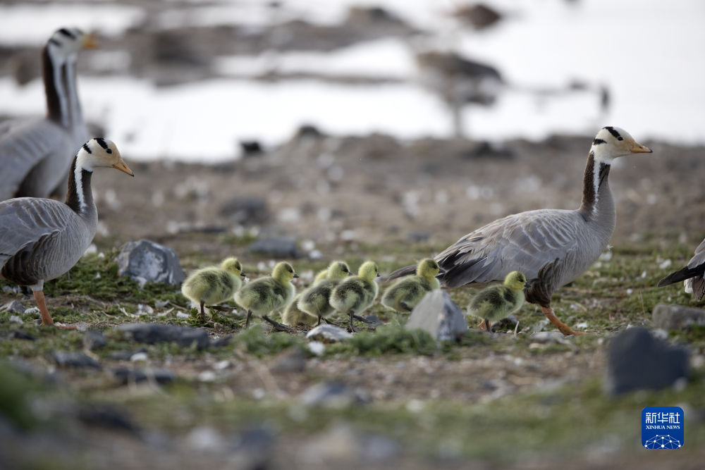幾只斑頭雁在青海湖鳥(niǎo)島濕地活動(dòng)(2020年6月2日攝)。新華社 星智 攝
