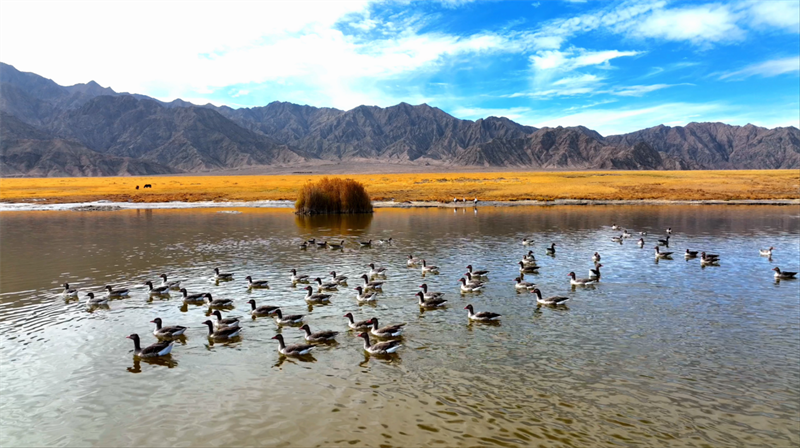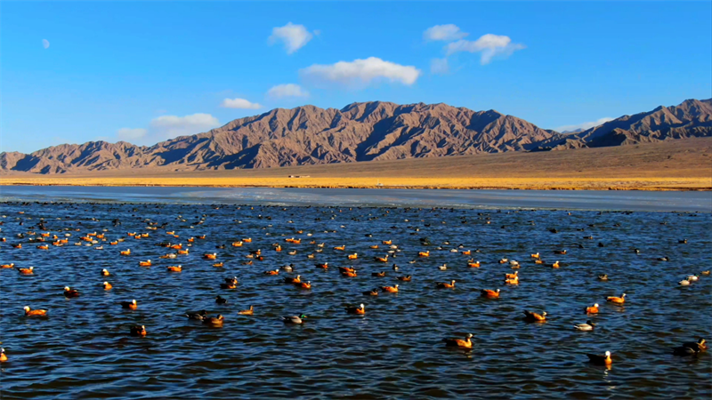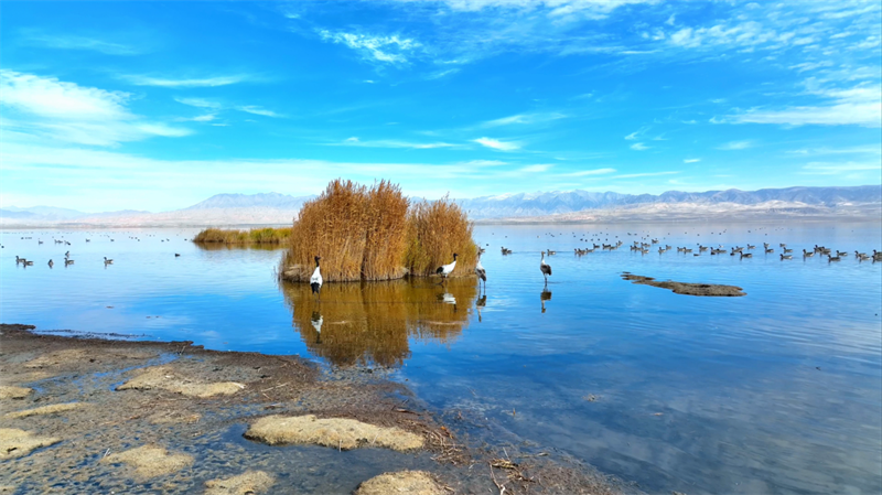 初冬時節(jié),在青海省海西蒙古族藏族自治州烏蘭縣都蘭湖國家濕地公園內(nèi),四只國家一級保護動物黑頸鶴,踏著黑色細長的腿在湖中閑庭信步,與斑頭雁、赤麻鴨一起嬉戲覓食,盡顯柴達木盆地濕地生態(tài)之美。