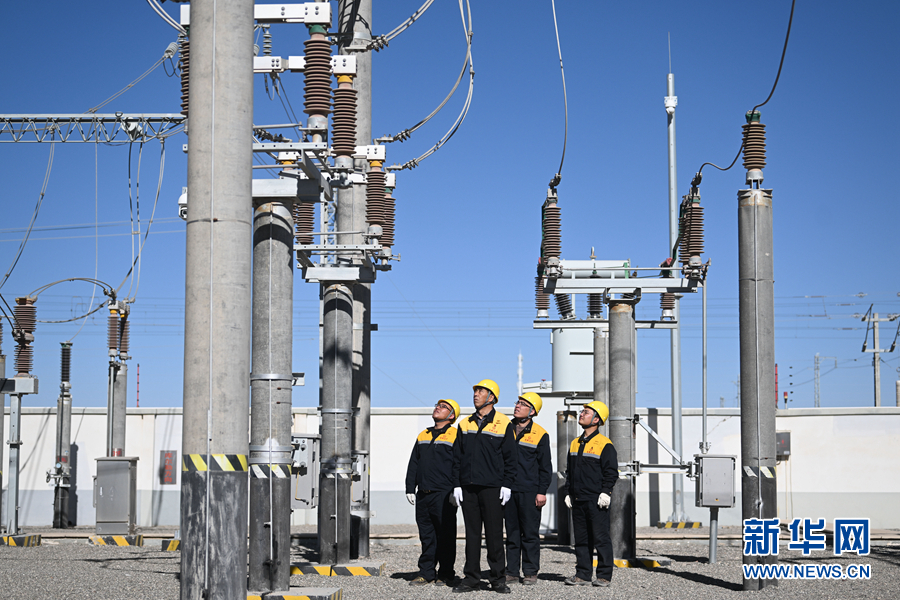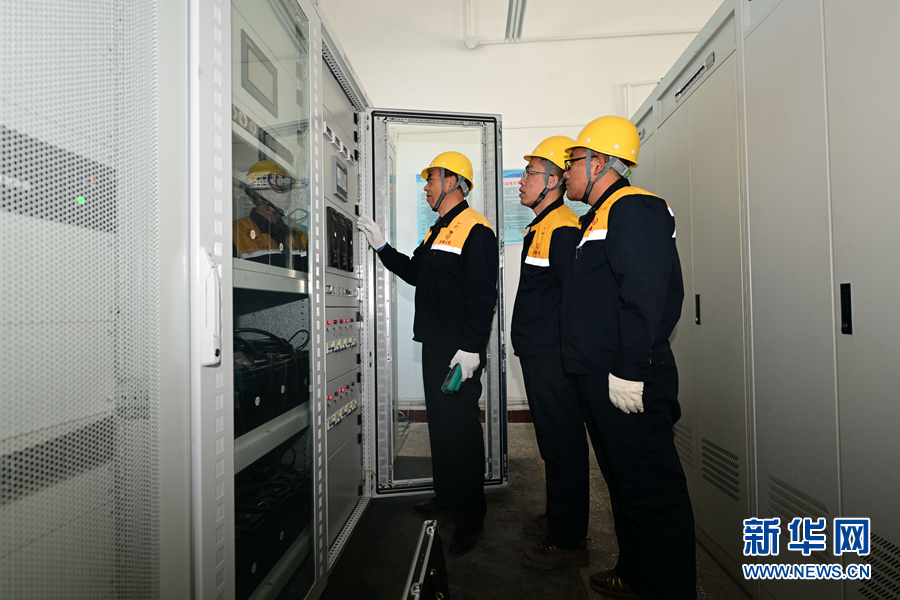 2月5日,在青藏集團有限公司西寧供電段格爾木南變電所,王永忠(左二)與同事在巡檢供電設備。新華社記者 張龍 攝