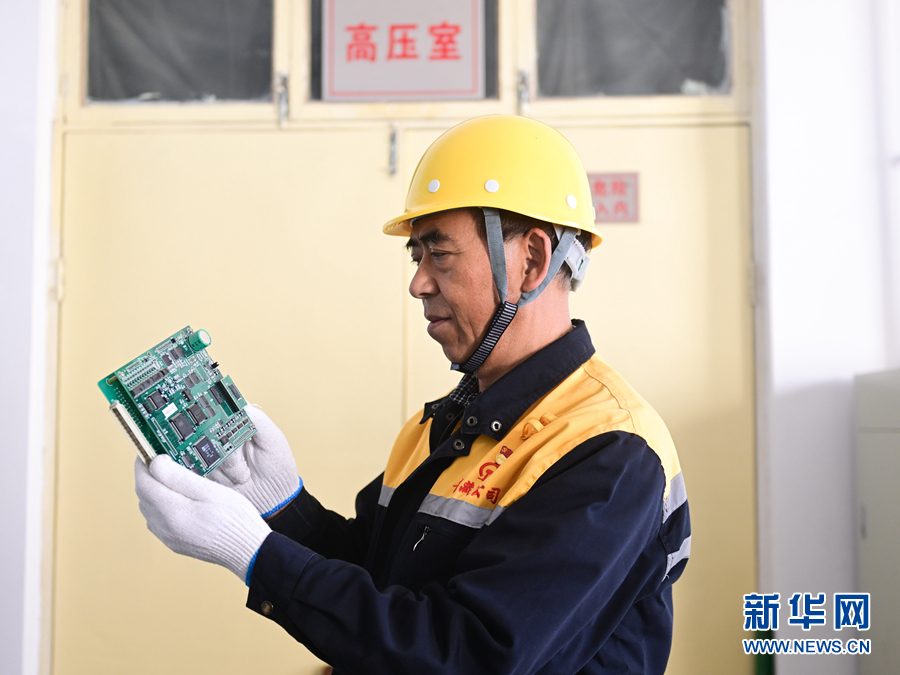 2月5日,在青藏集團有限公司西寧供電段格爾木檢修車間,王永忠在查看一塊電路板是否有故障。新華社記者 張龍 攝