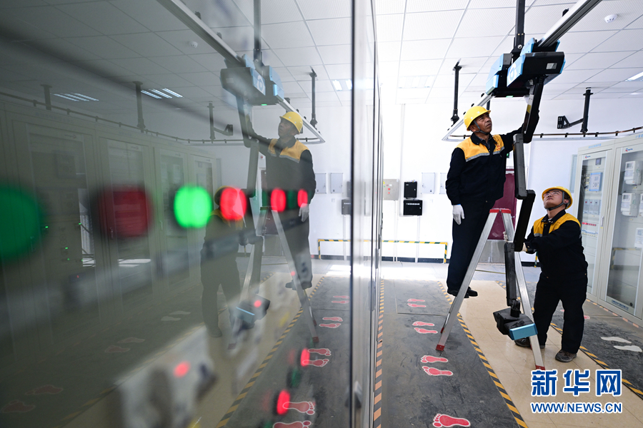 2月5日,在青藏集團有限公司西寧供電段格爾木檢修車間,王永忠與同事在巡檢保護裝置柜。新華社記者 張龍 攝
