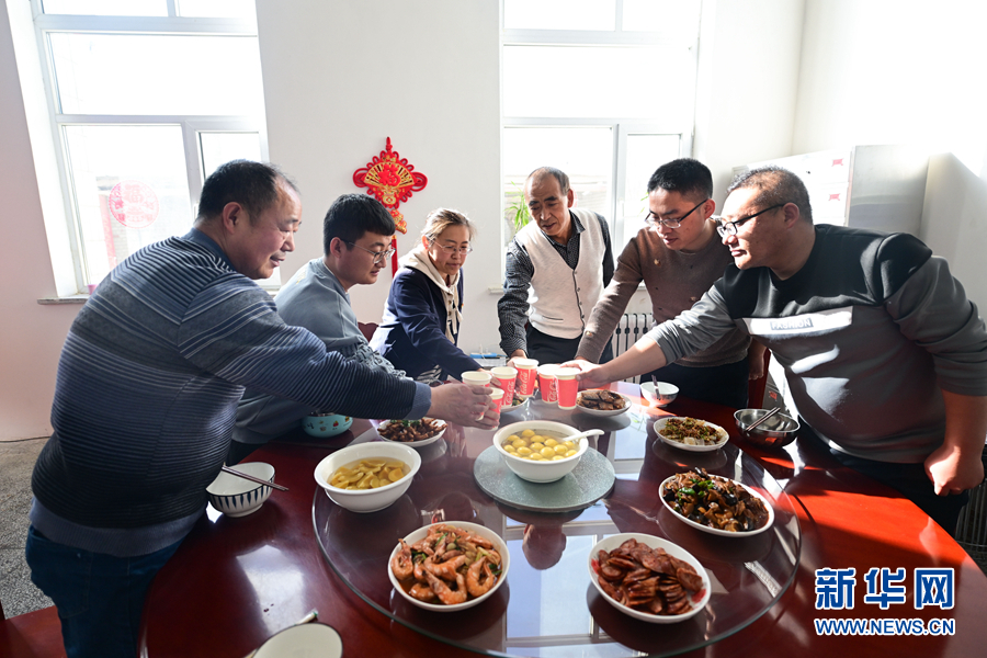 2月5日,在青藏集團有限公司西寧供電段格爾木檢修車間,王永忠與同事們舉杯慶祝元宵節(jié)。新華社記者 張龍 攝