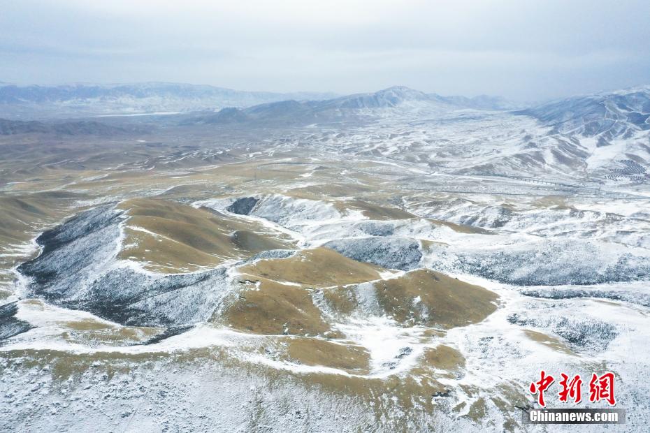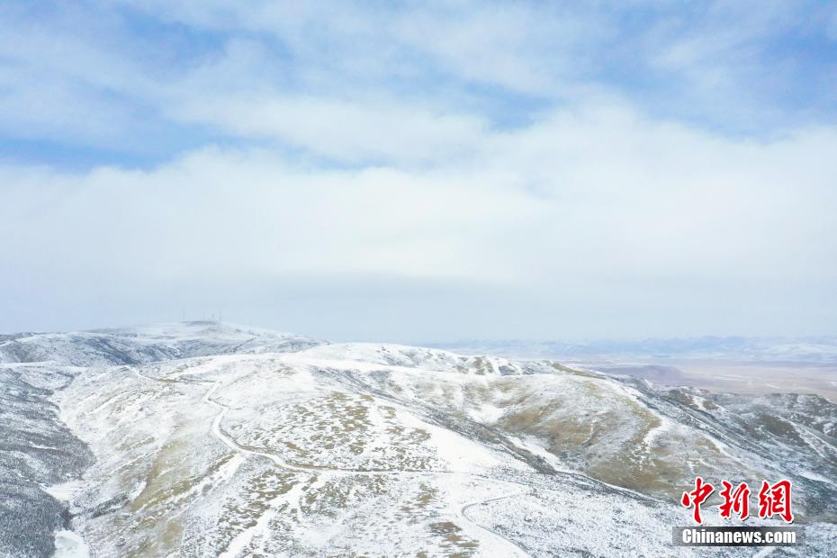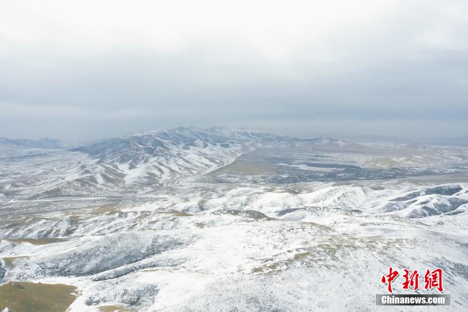 2月17日,航拍位于青海省海北藏族自治州海晏縣,祁連山脈同寶山壯美雪景。一場(chǎng)春雪過后,同寶山連綿的山巒被白雪覆蓋,遠(yuǎn)處的青海湖若隱若現(xiàn),盡顯壯美。