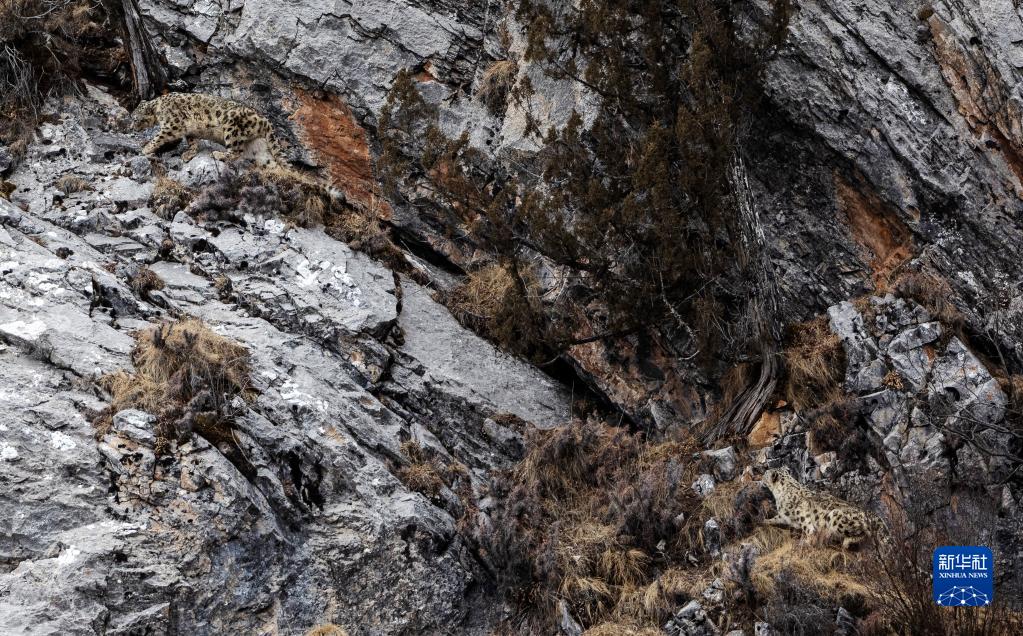 2月21日在青海省玉樹(shù)藏族自治州雜多縣昂賽鄉(xiāng)境內(nèi)的昂賽大峽谷內(nèi)拍攝的兩只雪豹。新華社記者 費(fèi)茂華 攝