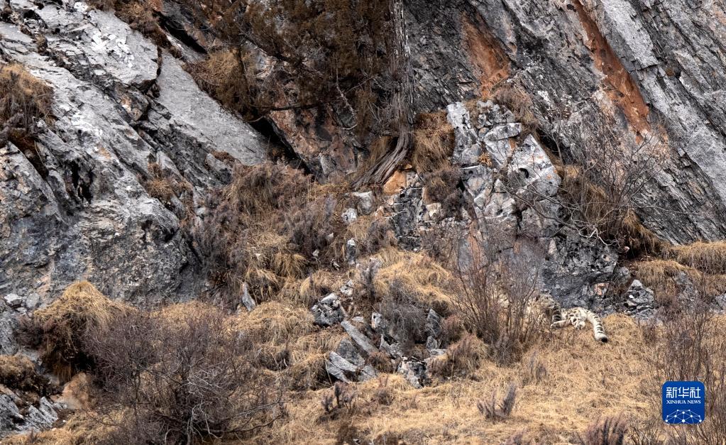 2月21日,在青海省玉樹(shù)藏族自治州雜多縣昂賽鄉(xiāng)境內(nèi)的昂賽大峽谷內(nèi),一只雪豹在休息。新華社記者 費(fèi)茂華 攝