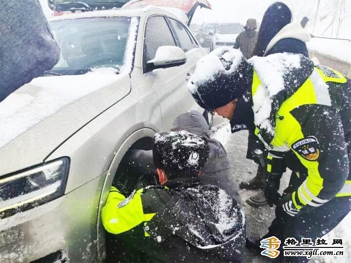 2月22日,大雪使白馬雪山路面積雪結冰,導致上百輛汽車擁堵滯留,交警冒著嚴寒疏導交通。