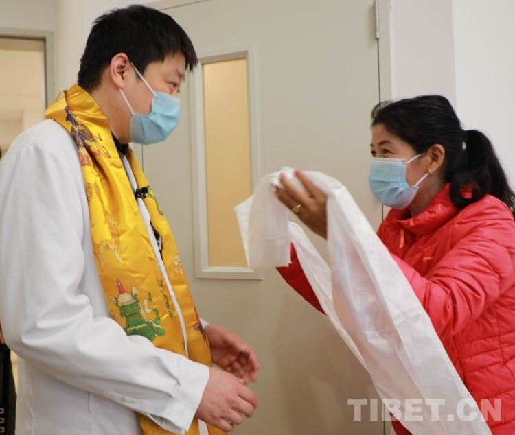 圖為來自青海省果洛藏族自治州的唇腭裂患兒家屬為中國醫(yī)學(xué)科學(xué)院整形外科醫(yī)院唇腭裂整形科主任宋濤獻(xiàn)上哈達(dá) 攝影:劉莉