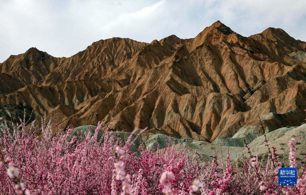 4月8日拍攝的青海貴德國(guó)家地質(zhì)公園丹霞地貌與盛開(kāi)的春花。新華社記者 黃豁 攝