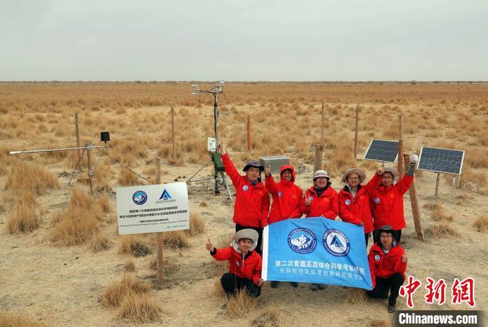 經(jīng)過不懈努力,格爾木濕地站終于建成,第二次青藏科考中科院空天院分隊(duì)在站前合影慶祝。中新社記者 孫自法 攝