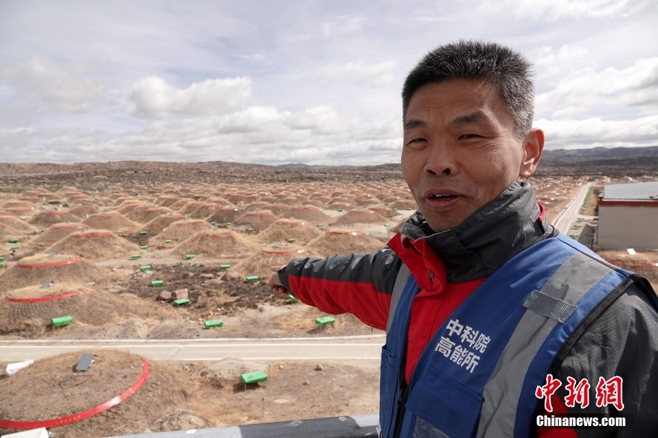 圖為國家驗(yàn)收之前的4月22日,四川稻城海子山,“拉索”總工藝師、中國科學(xué)院高能物理研究所研究員何會海介紹大科學(xué)裝置建設(shè)相關(guān)情況。中新社記者 孫自法 攝