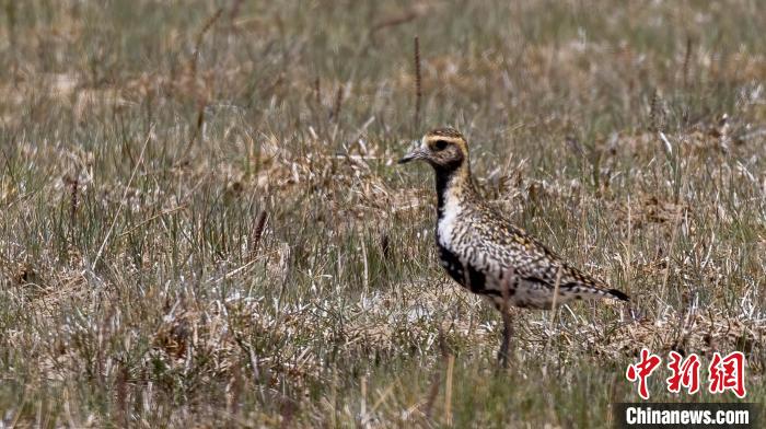 圖為金斑鸻在草叢覓食??唆斂撕兴睾匀槐Wo(hù)區(qū) 攝